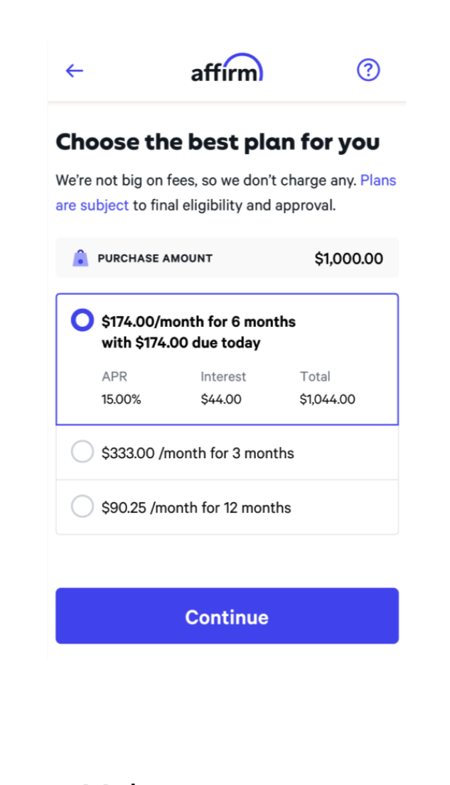 Affirm doesn’t charge late fees or hidden fees of any kind, ever.